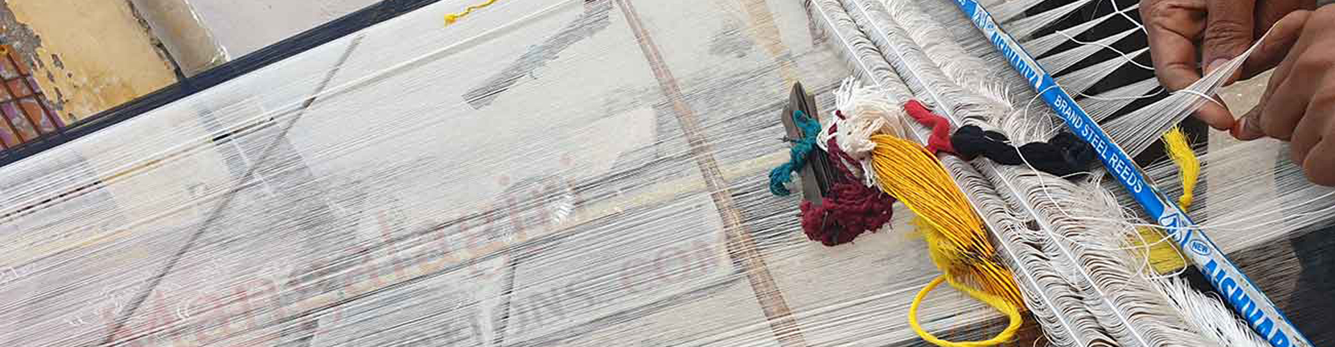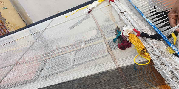 Mangalagiri Handlooms use unique way of processing warp yarn. Each warp is for 4-5 sarees. So, it is very important to make sure all the threads in the warp are smooth and not attached with one other. The above image show our warp process.
