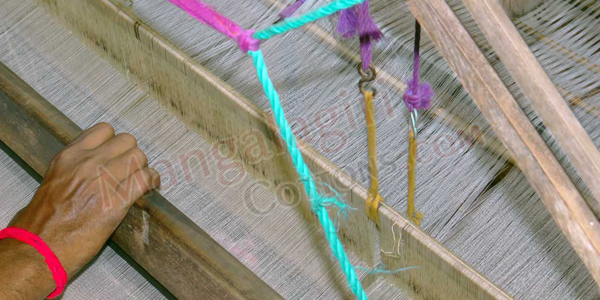 Once we process the warp, we fix this to loom and start weaving process. At this point we also attach zari threads to warp to make zari boarders on Mangalagiri sarees. In general, a weaver can weave a Mangalagiri Saree in 1-2 days. The weaving time may vary based on the saree design.